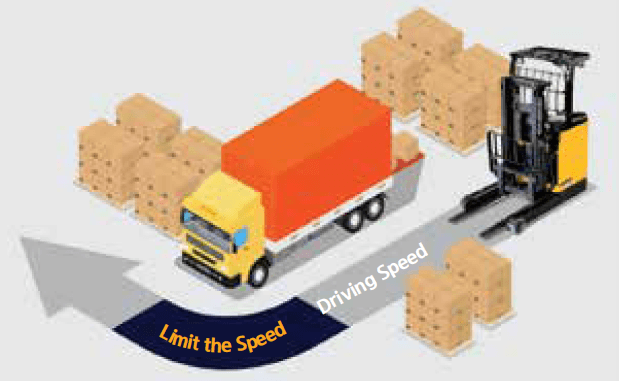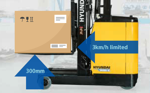 For safety reasons, the travel speed is limited to 3km/h (this limit is adjustable) when the fork is raised by more than 300 mm from the ground in the case of double-stage mast or if the free lift zone is exceeded in the case of the triple mast.
