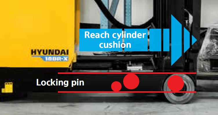 The eccentric shaft used in the mast undercarriage reduces mast shaking during reach in–out operations. In addition, the hydraulic cushion in the added reach cylinder lowers shock during reach out.