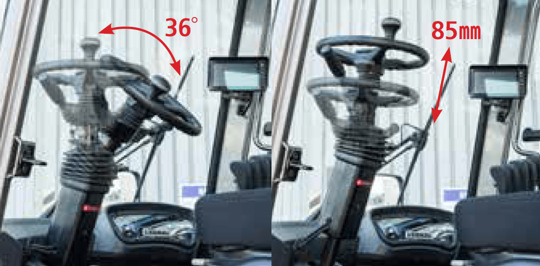 The problem of heavy handle when handling abruptly is improved, as now the handle can be adjusted up and down by 85mm and front and back by 36 degrees. In addition, the work convenience of the driver is improved with the handle diameter being reduced down to 35mm.