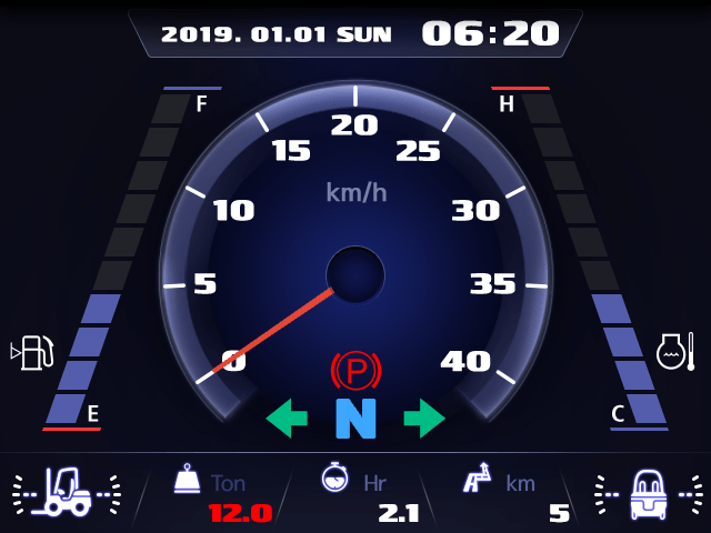 The road slope is sensed and displayed in real time. When the set value is exceeded, the symbol turns red, and a warning buzzer goes off. In addition, the optional cargo weighing device issues an alarm for safety in case of overload.