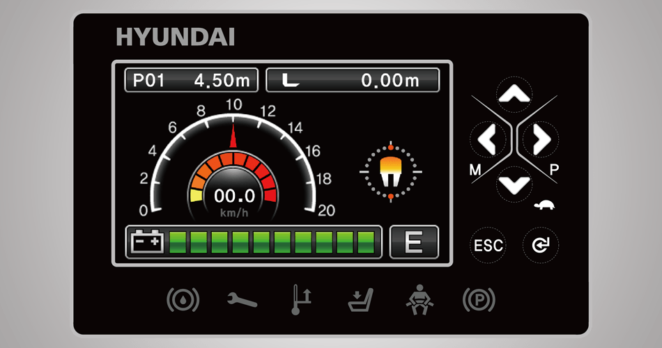 The LCD monitor with 3.2 inch graphic smart display allows the operator to easily and efficiently control the machine. The monitor provides information about speed & accelerator level, steer angle & travel direction, battery discharge indicator, hour meter & working mode.