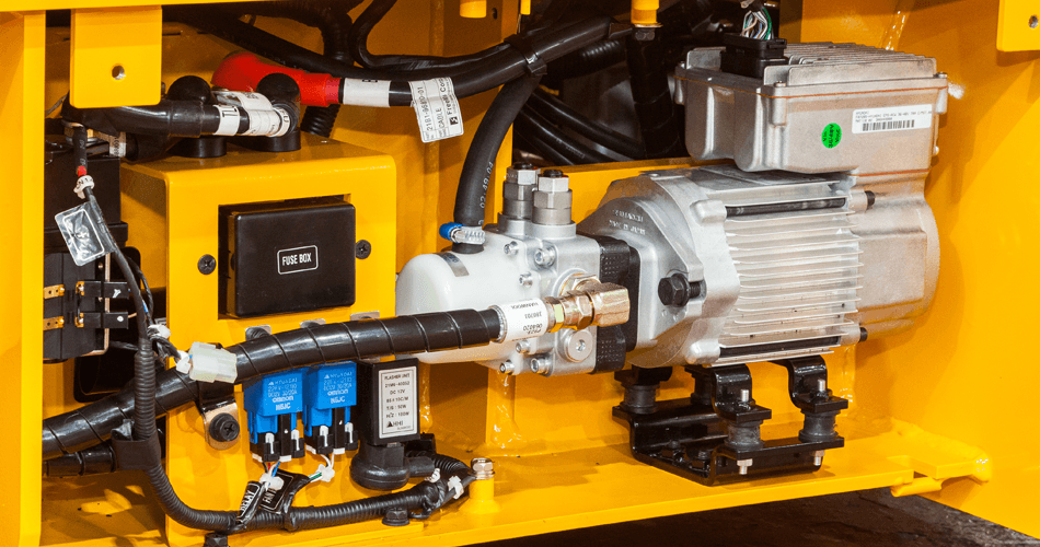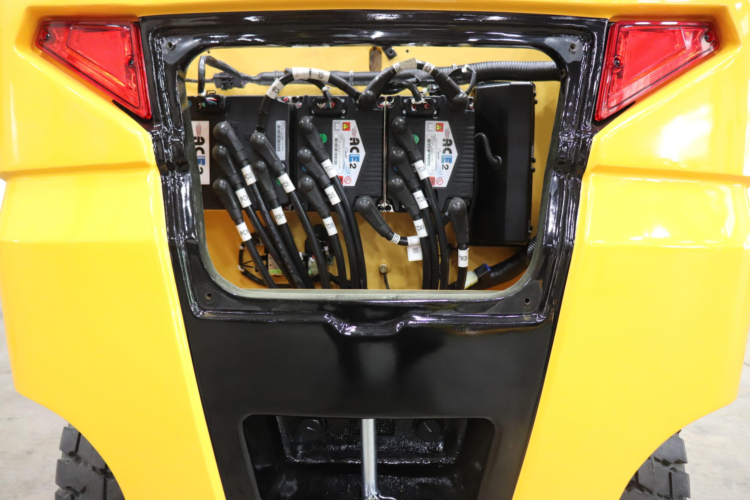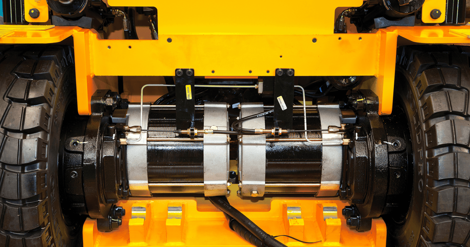 The dual drive motor system consists of two separately controlled brushless AC drive motors. As opposed to a single drive motor forklift, the dual drive motors are more energy efficient and provide smaller turning circles as they operate independently.