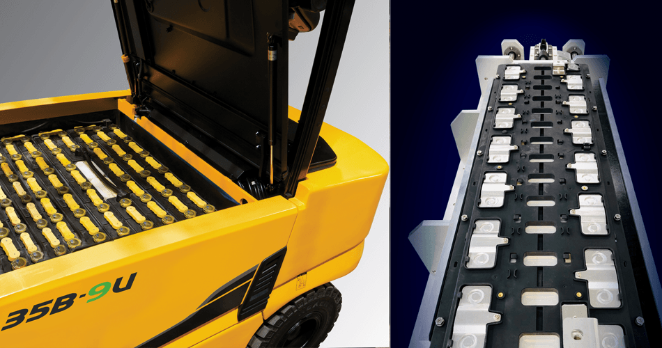 Introducing the upgraded Hyundai 9 series 48 volt electric three wheel design counter balance forklifts. The B-9U Series brings customers added value with market leading energy efficiency and enhanced powertrain durabilty. This forklift is unique in that it is also capable of running on a Lithium ion battery with no cost of modifications.
