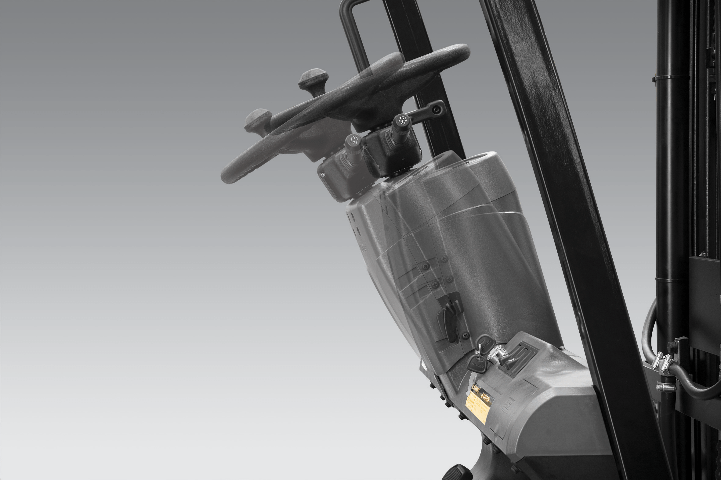 Featuring a horn button and a right-hand lever, the steering wheel can be adjusted by the operator for comfortable positioning.
